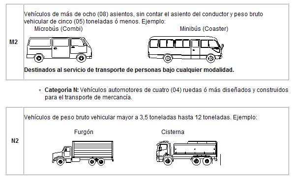 - Categoría M: Vehículos automotores de cuatro (04) ruedas ó más diseñados y construidos para el transporte de pasajeros.